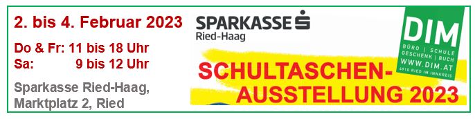 SCHULTASCHEN-AUSSTELLUNG 2023 2. bis 4. Februar wieder in der Sparkasse Ried-Haag Am Do 2. und Fr. 3. Februar von 11 – 18 Uhr am Sa 4. Februar von 9 – 12 Uhr präsentieren wir wieder: * 150 verschiedene Modelle ...