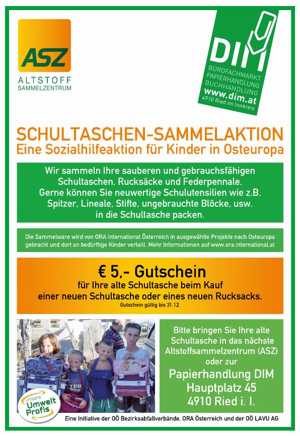 Wir sammeln Ihre alte Schultasche für einen guten Zweck. Nicht nur Kinder aus Osteuropa düren sich über die gebrauchten Taschen freuen, sondern auch Kinder aus der Region profitieren von der Sammelaktion.